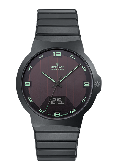 Massima precisione in un’elegante ceramica: il Force Mega Solar coniuga non solo l’energia radio con quella solare, ma anche il design con il comfort e la resistenza ai graffi. E dal momento che i movimenti radiocontrollati sono tutt’oggi i più precisi, quest’orologio è un partner affidabile al 100% per ogni situazione di vita. L’orologio può essere impostato tramite l’app Junghans MEGA. TECNOLOGIA Meccanismo solare radio multifrequenza J615.84 FUNZIONAMENTO Durata di carica al buio fino a 21 mesi, sleep mode dopo 72 ore, data con caratteri grandi, comoda regolazione dell’ora tramite l’app Junghans MEGA CASSA ceramica lucidata, fondo involucro ceramica, Ø 40,4 mm, altezza 8,2 mm VETRO di zaffiro QUADRANTE solare con madreperla, lancetta con massa luminosa ecologica IMPERMEABILITÀ impermeabile fino a 5 bar
